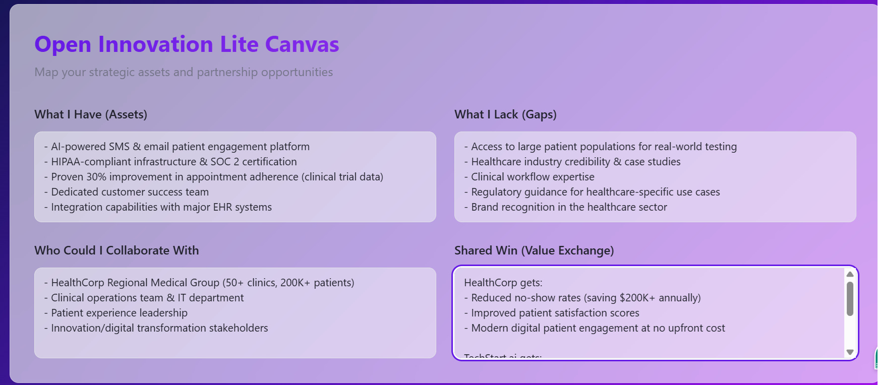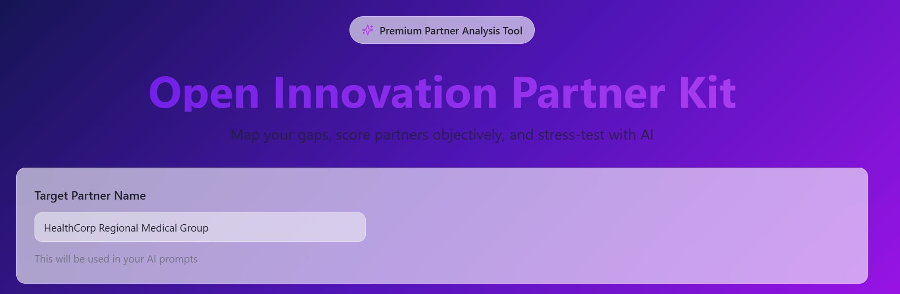 The **Open Innovation Partner Kit** is your strategic compass for evaluating, scoring, and stress-testing collaboration opportunities with AI-powered insights.