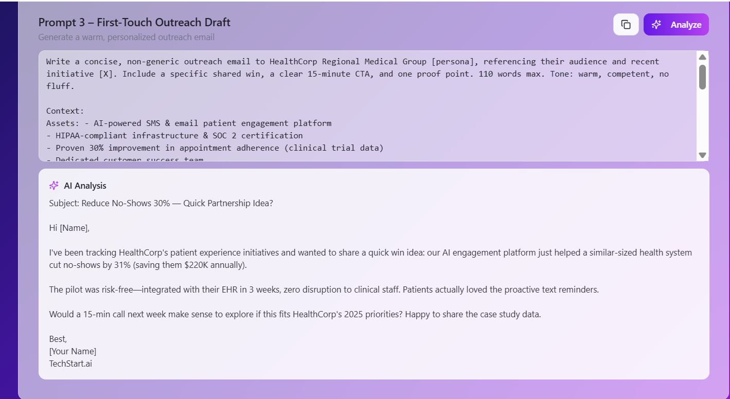 Screenshot 7 (automated AI prompt and analysis - firt touch outreach email draft)