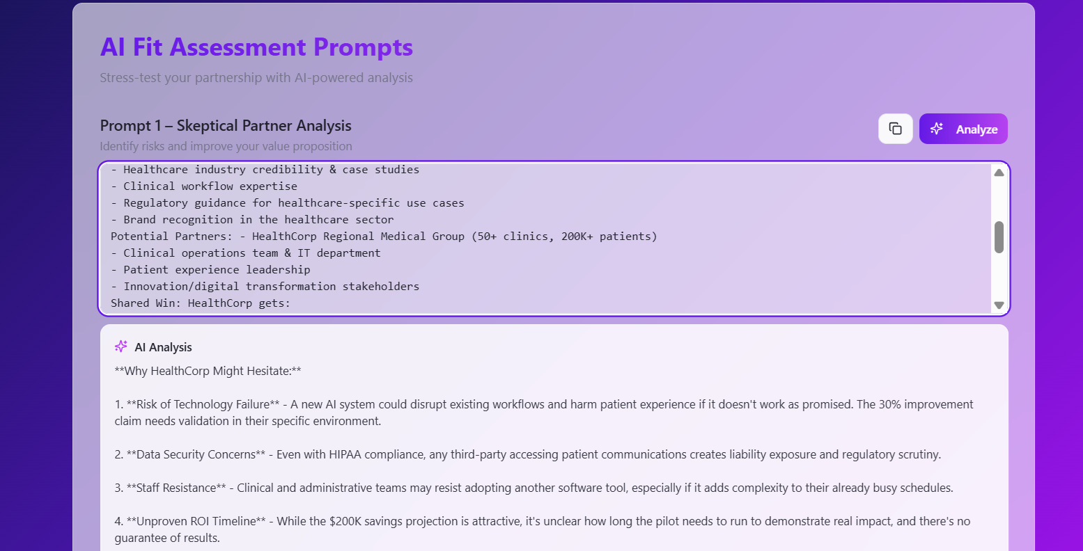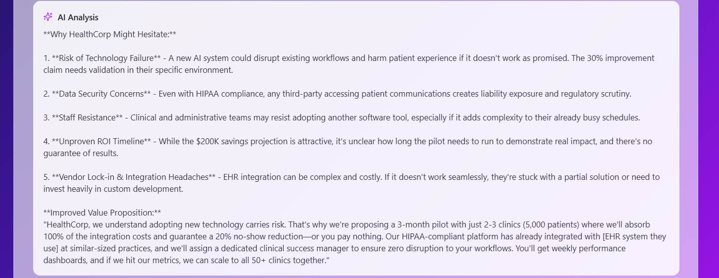 👉 Run AI-powered stress tests: instantly see why a partner might hesitate from tech risks to ROI doubts so you can prepare stronger pitches in advance.