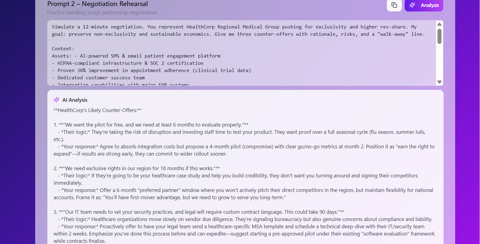 Simulate a 12-minute negotiation. You represent [PartnerName] pushing for exclusivity + higher rev-share. My goal: preserve non-exclusivity and sustainable economics. Give me three counter-offers with rationale, risks, and a “walk-away” line.