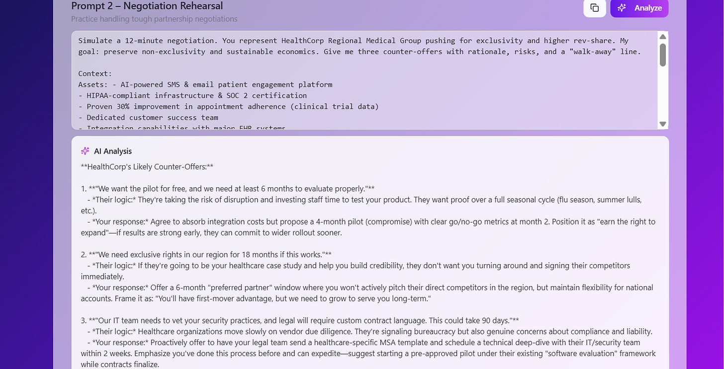 👉 Use AI to rehearse tough negotiations simulate counter-offers, see their logic, and get tailored responses so you walk in prepared, not blindsided.
